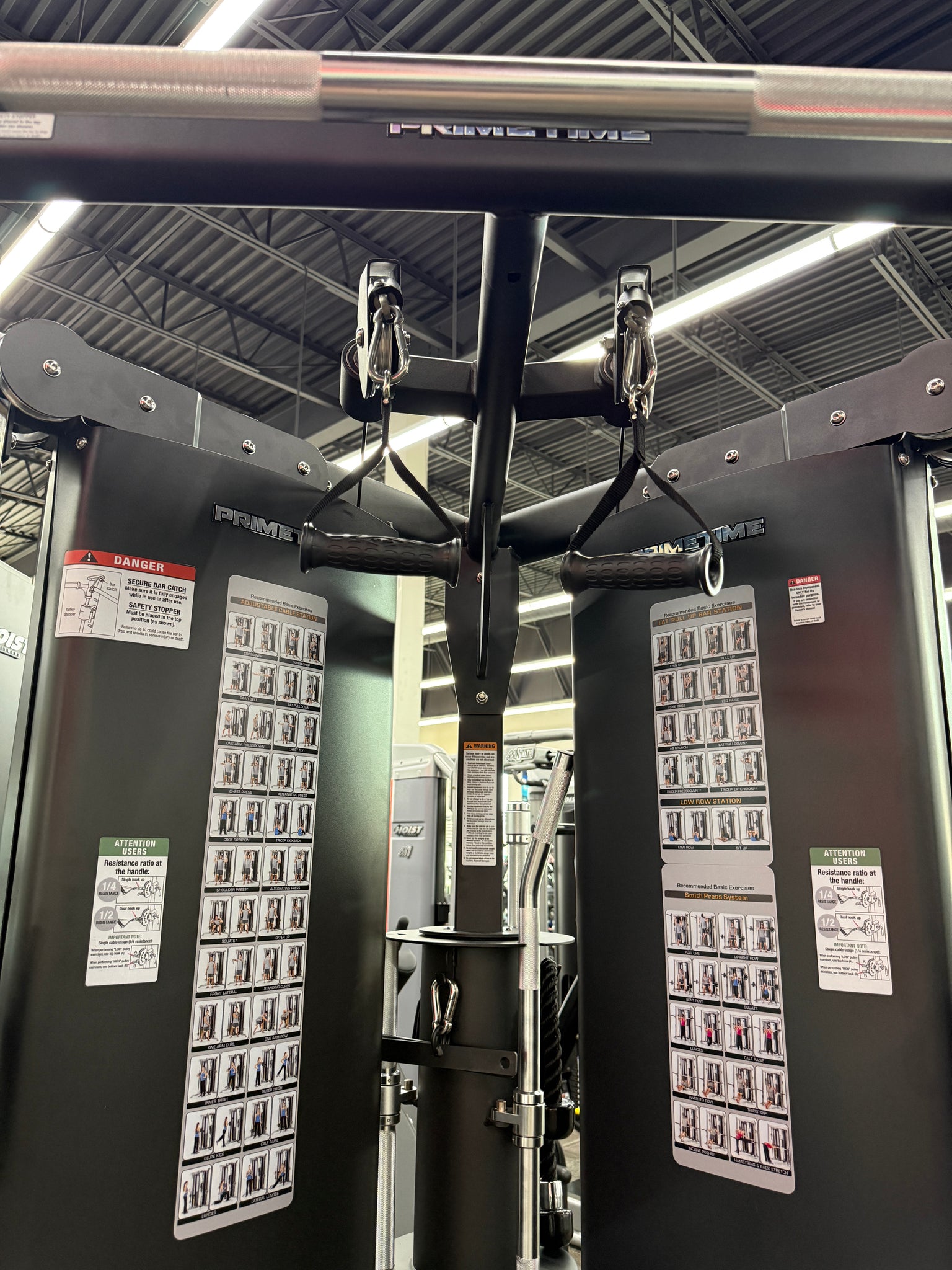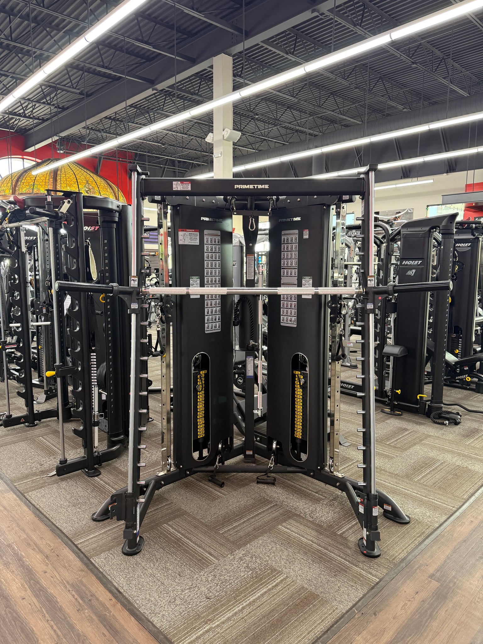 The Primetime Corner Multi-Functional Trainer with Smith Press Attachment (CXT-225) features dual weight stacks and three separate cable stations. Offering unlimited exercise options in one space saving, highly adjustable and compact corner machine.